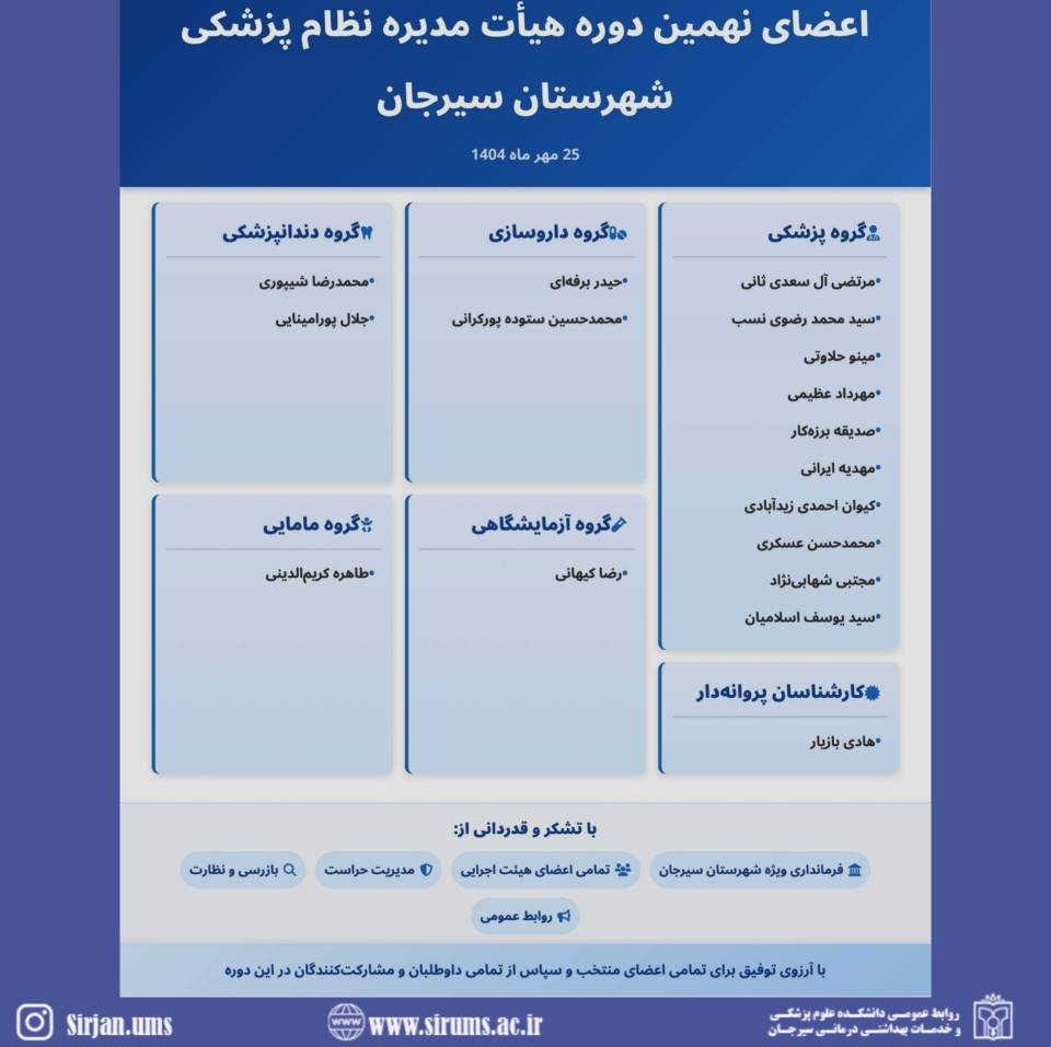 با پایان یافتن رایگیری در تاریخ ۲۵ مهرماه ۱۴۰۴، اعضای جدید هیأت مدیره نظام پزشکی شهرستان سیرجان از بین نمایندگان گروههای مختلف پزشکی و پیراپزشکی معرفی شدند.
